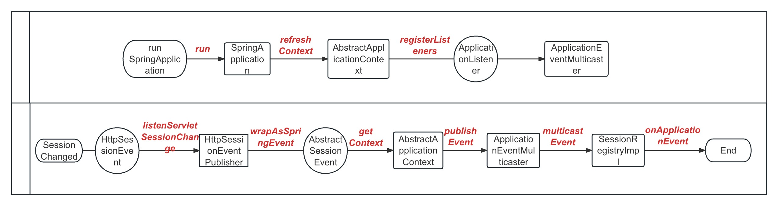 在SessionRegistryImpl中实现了ApplicationListener接口, 订阅并处理AbstractSessionEvent - 对应观察者模式中的事件监听 (ApplicationListener) 角色 。